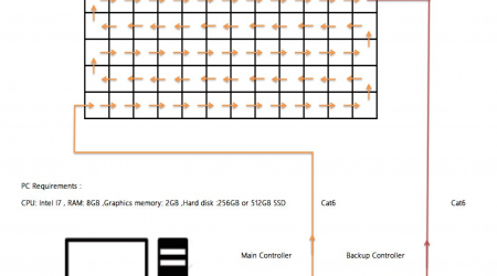 The screen runs 10 electrical circuits to power 60 LED floor tiles in order to avoid a complete blackout if the power were to be cut. Each line holds 5 LED panels and has a maximum consumption of 16,6KW. This diagram is for reference to know how the power is being connected. All cables are labeled and directly connected to the control room.